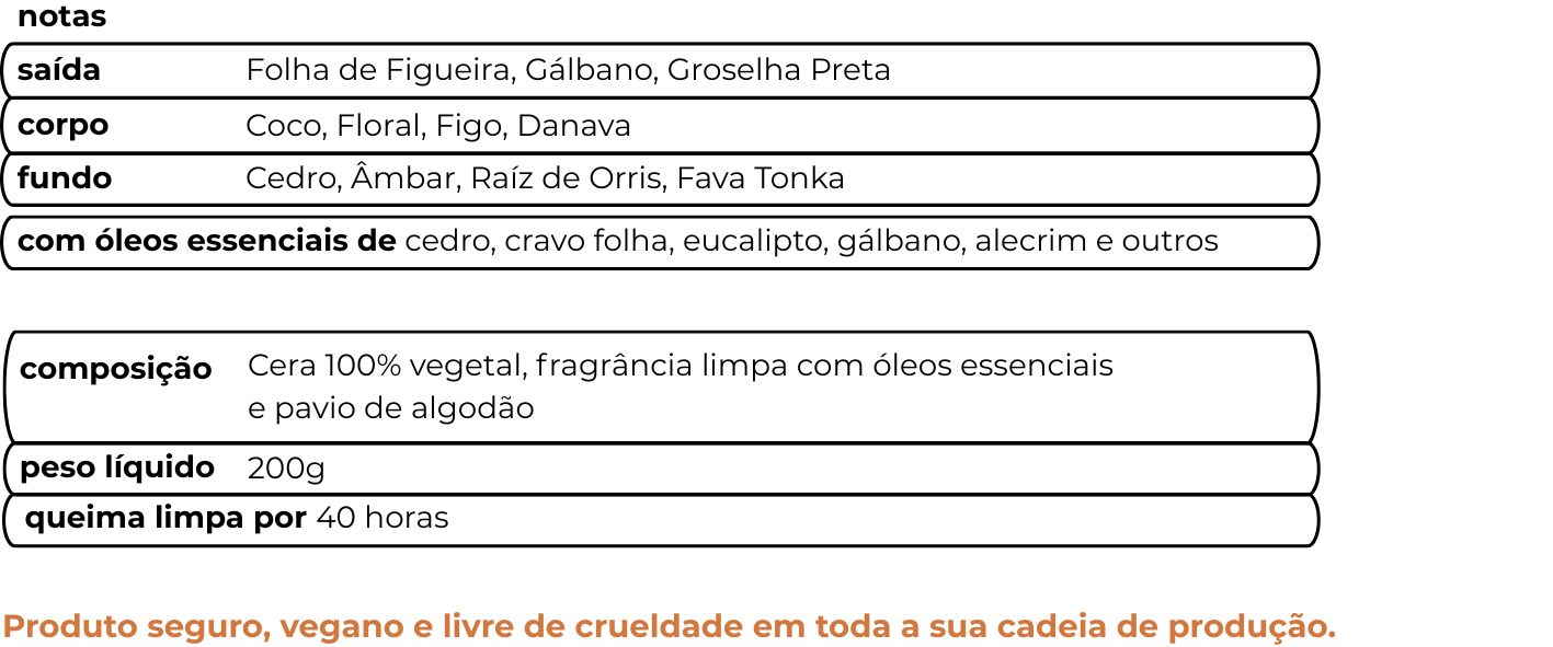 As notas verdes e frescas da folha de figueira são realçadas pelo aroma terroso e resinoso do gálbano, criando uma mistura harmoniosa e revigorante.